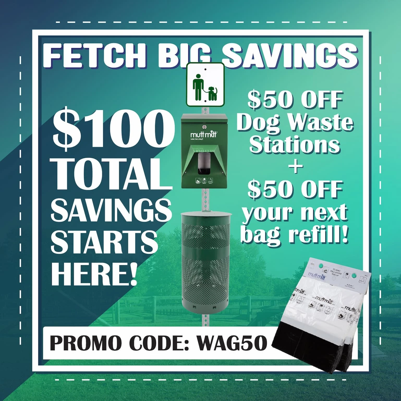 $50 OFF Dog Waste Stations + $50 OFF Your Next Bag Order — Use Code WAG50